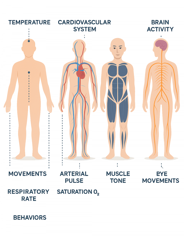 Simultaneous monitoring of EEG, muscle tone, heart rate, SpO₂, respiration, and movement.