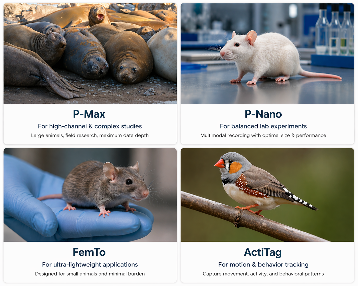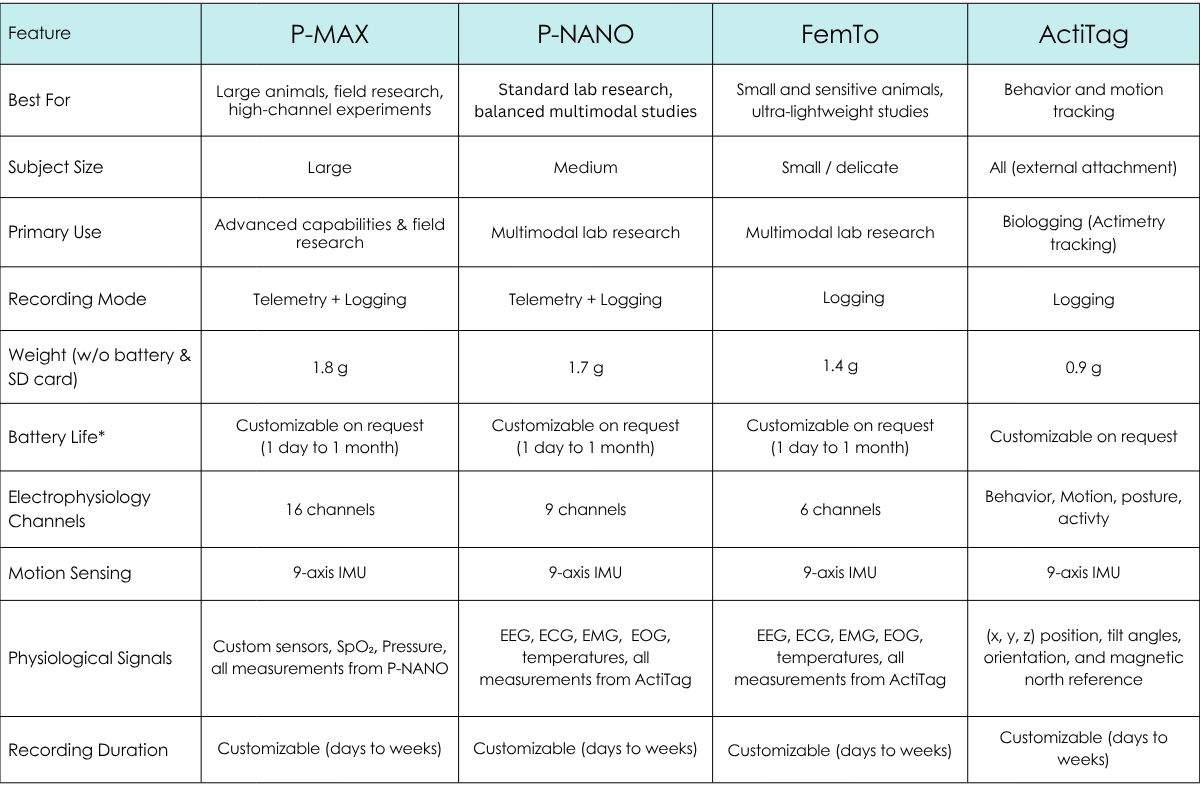 Each system is designed for specific research needs. P-Nano is ideal for compact laboratory setups, P-Max supports high channel and complex experiments, FemTo focuses on ultra lightweight recording, and ActiTag is optimized for motion and behavioral tracking.